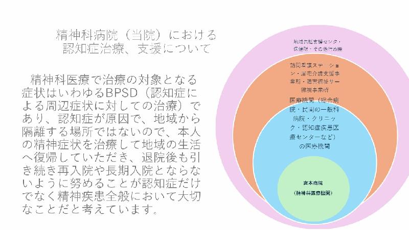 テーマ別に、1.宮本病院の取り組み紹介、2.もの忘れ外来の特徴・認知症治療病棟について、3.精神科医療機関の認知症支援の強みと課題にわけてご説明していただきました。